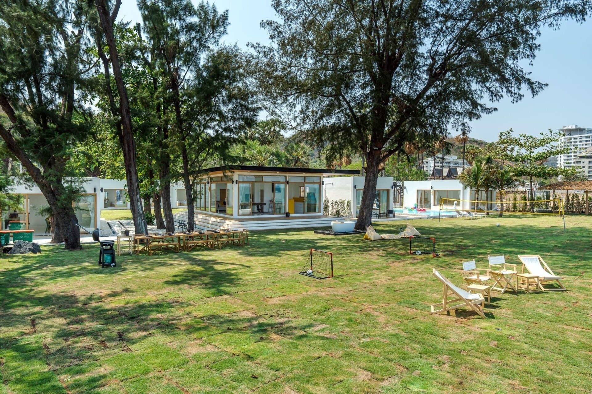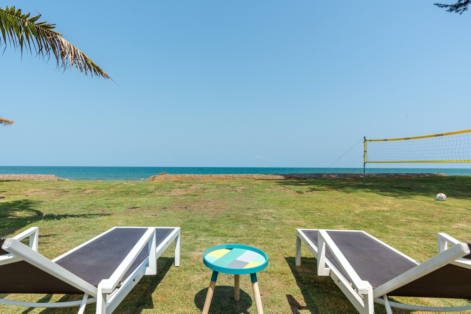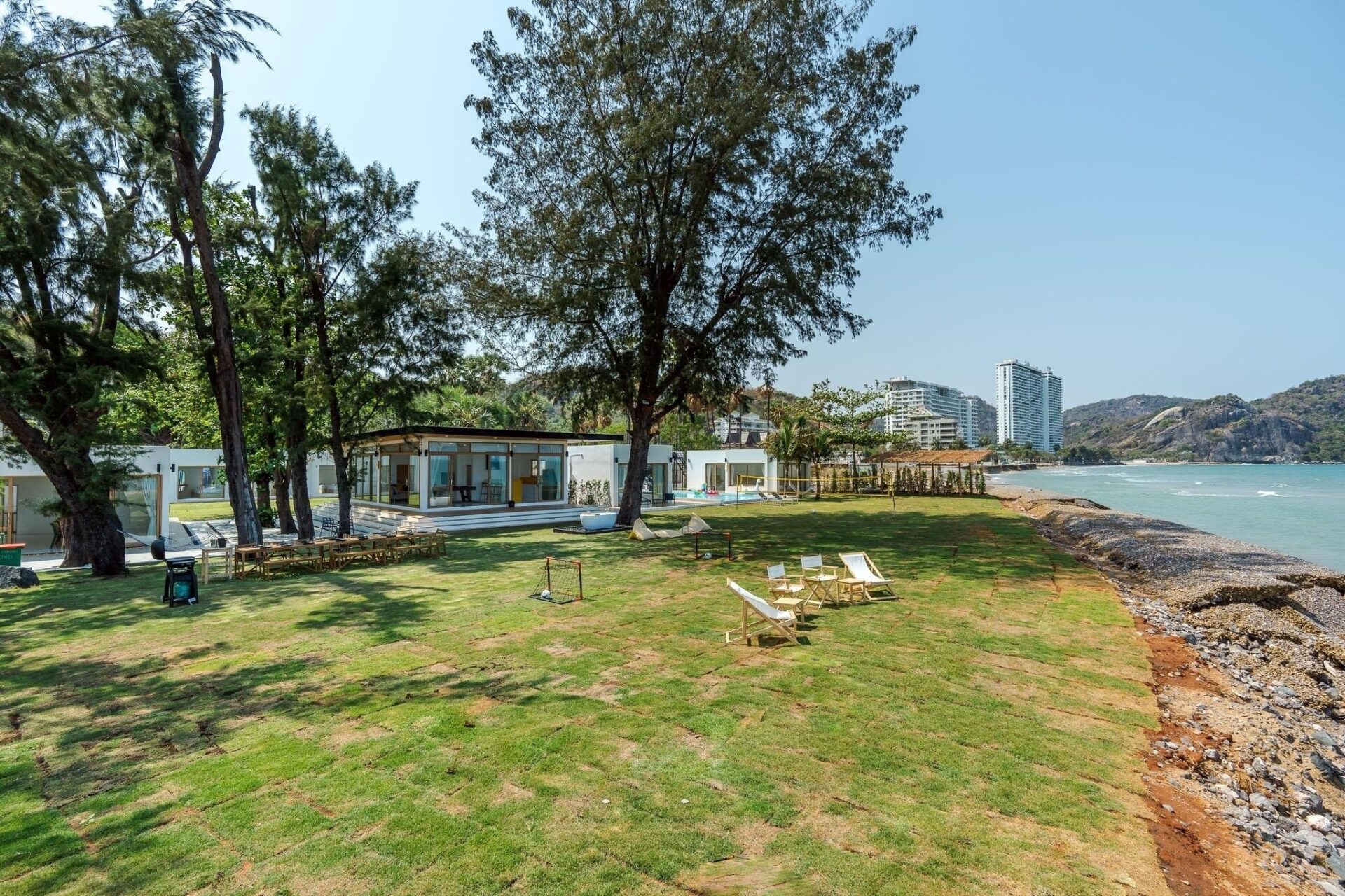 บ้านพักพูลวิลล่าหัวหินหลังนี้มีพื้นที่สนามหญ้าขนาดใหญ่ติดทะเล