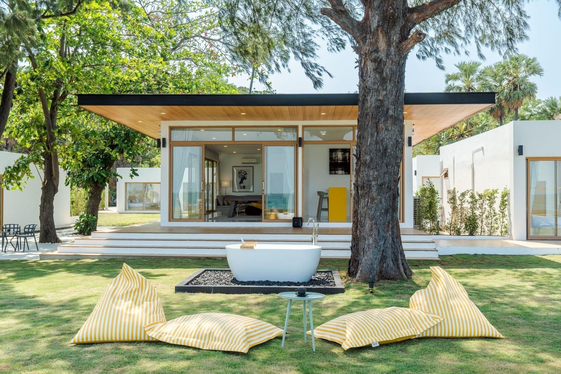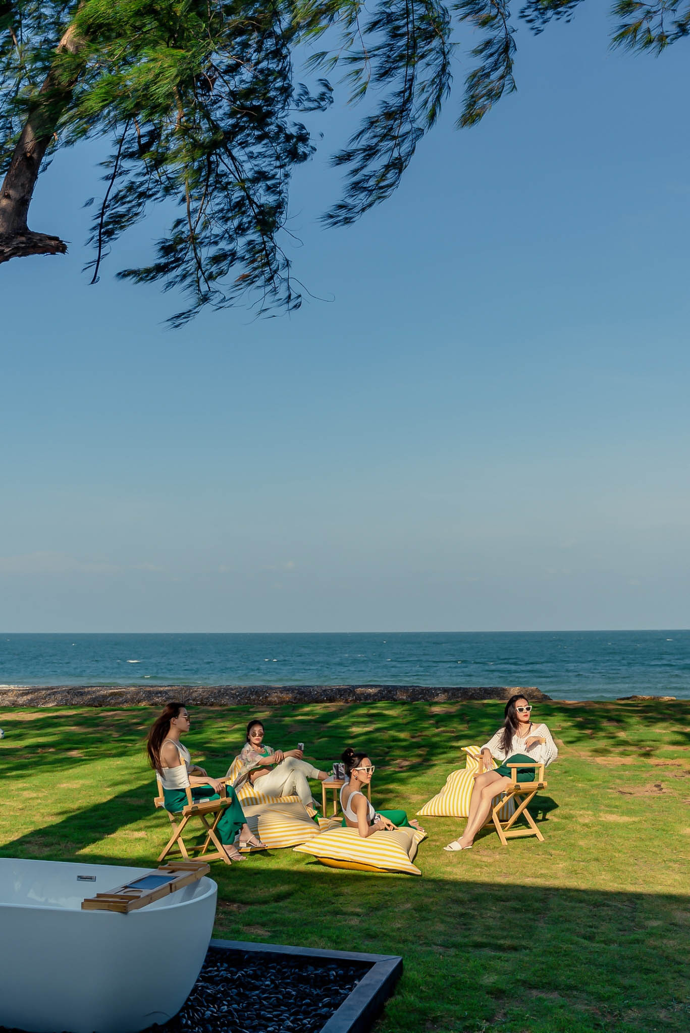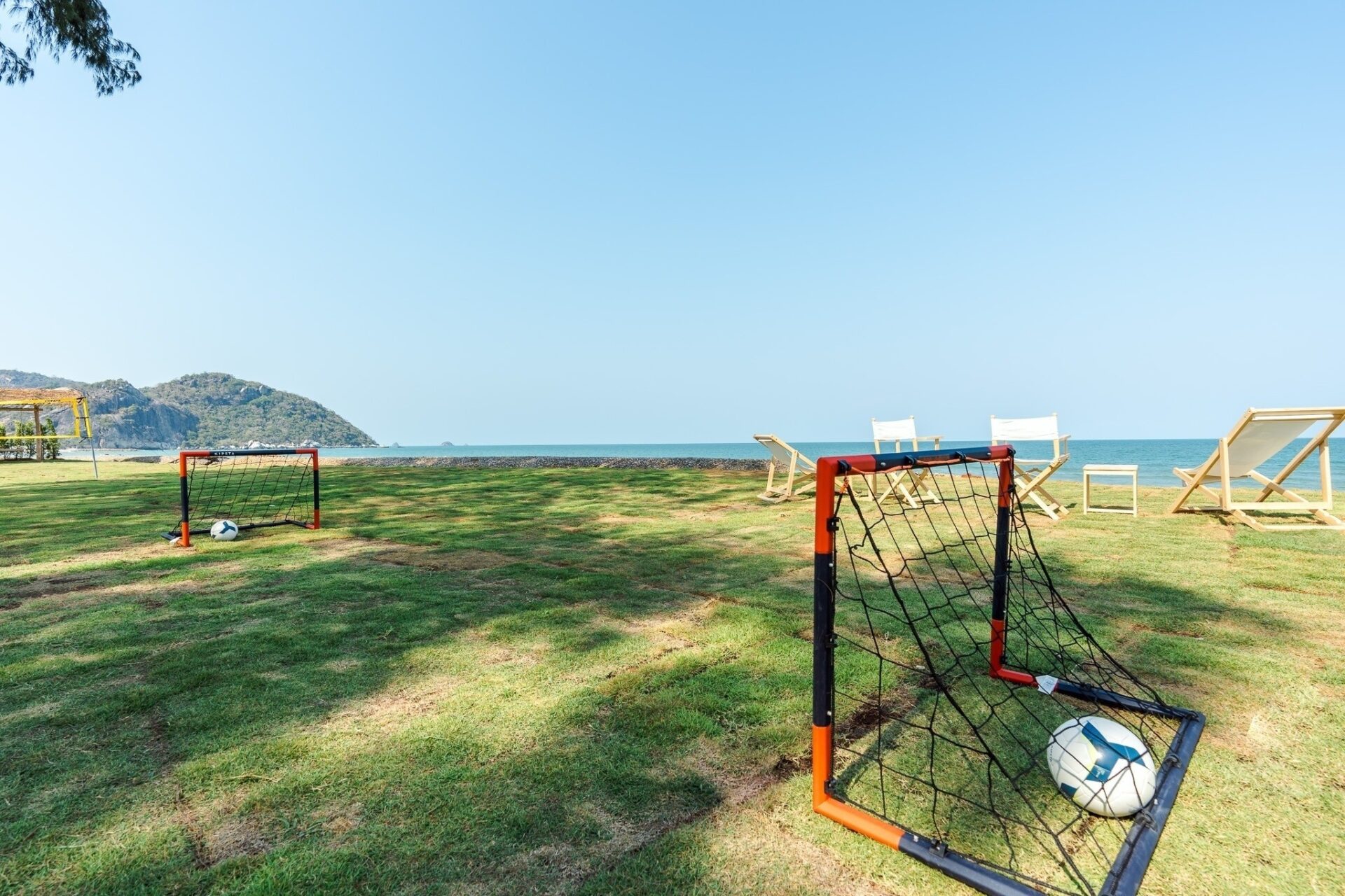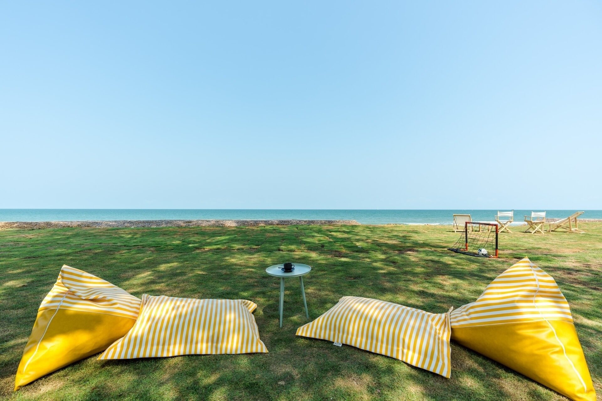 บ้านพักพูลวิลล่าหัวหินหลังนี้มีพื้นที่สนามหญ้าขนาดใหญ่ติดทะเล