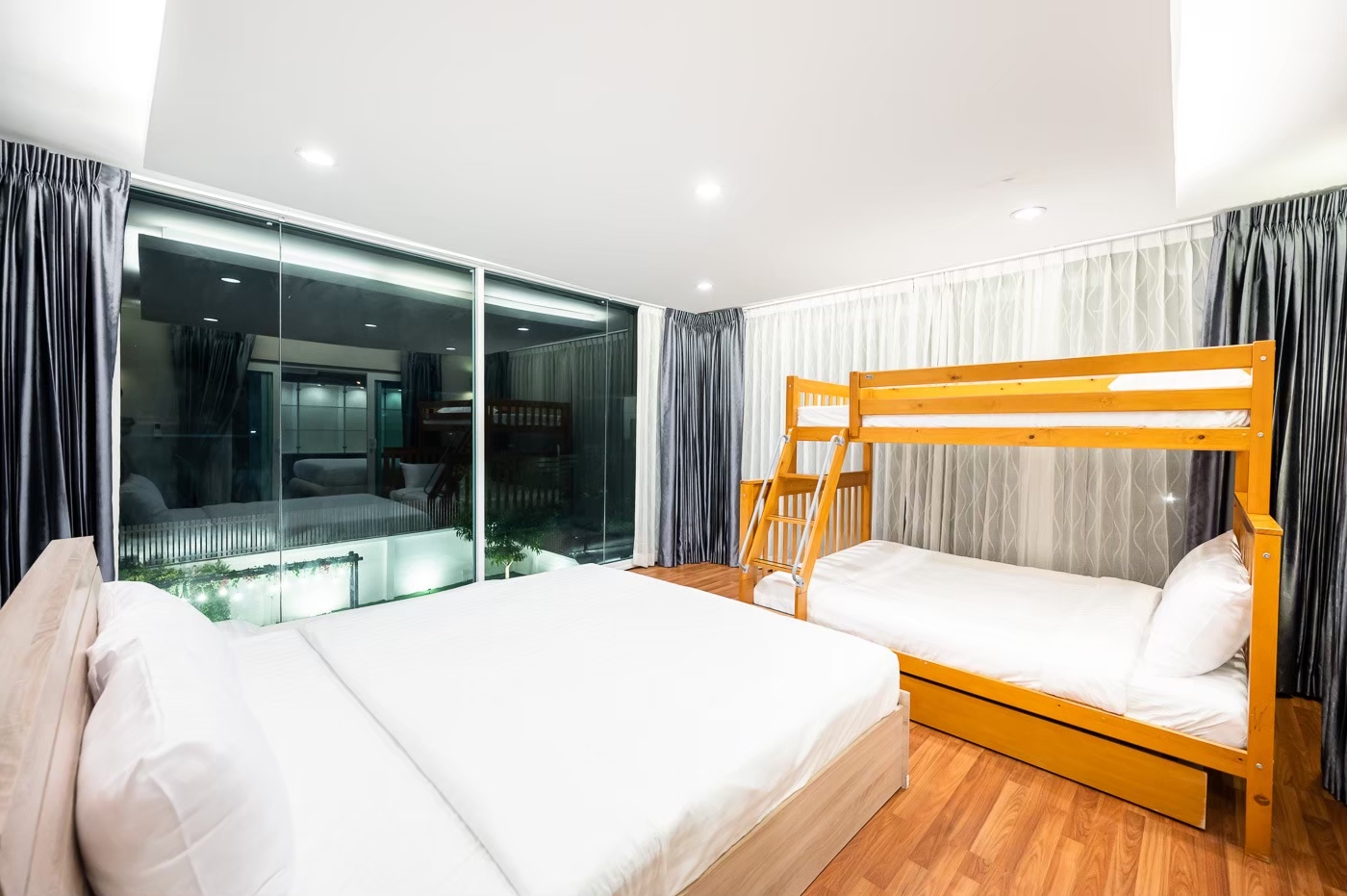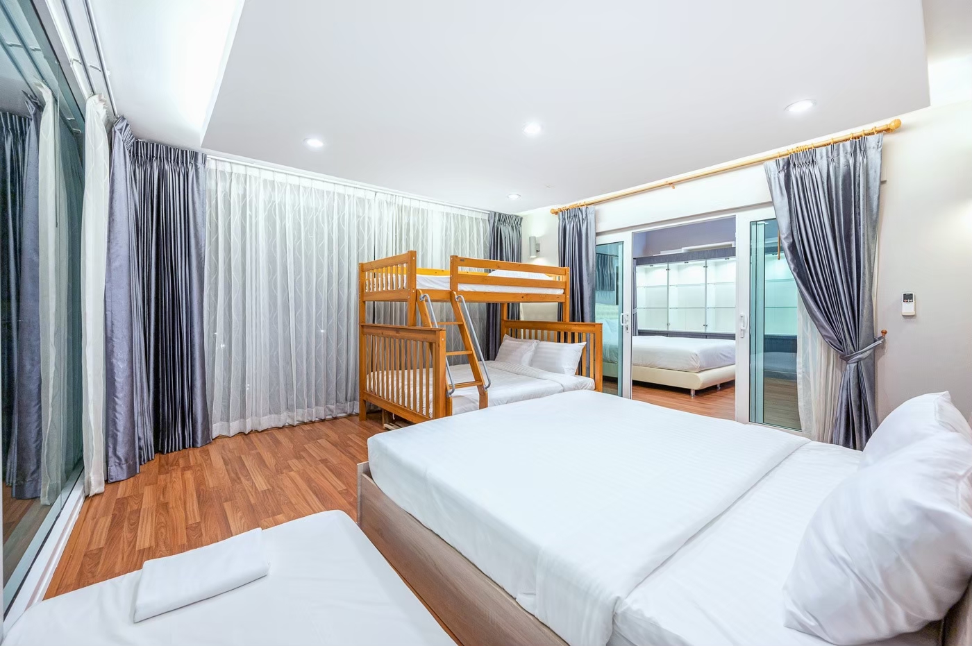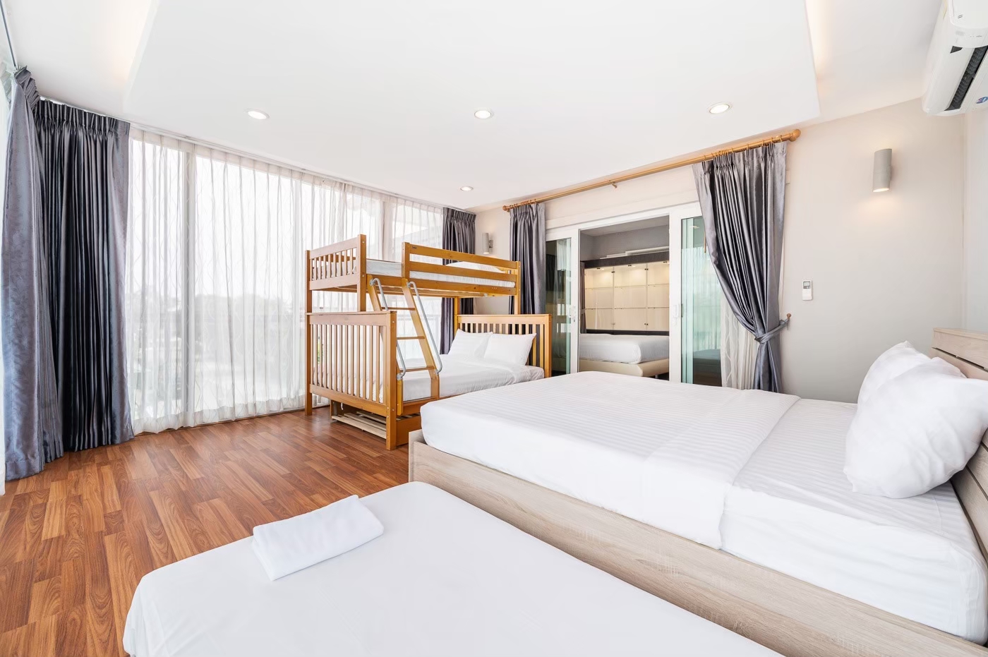 - ห้องนอน 5 : เตียง 6 ฟุต 1 เตียง + เตียง 3 ฟุต 1 เตียง + เตียง 2 ชั้น (ห้องนี้เข้าได้ผ่านห้องนอน 4)