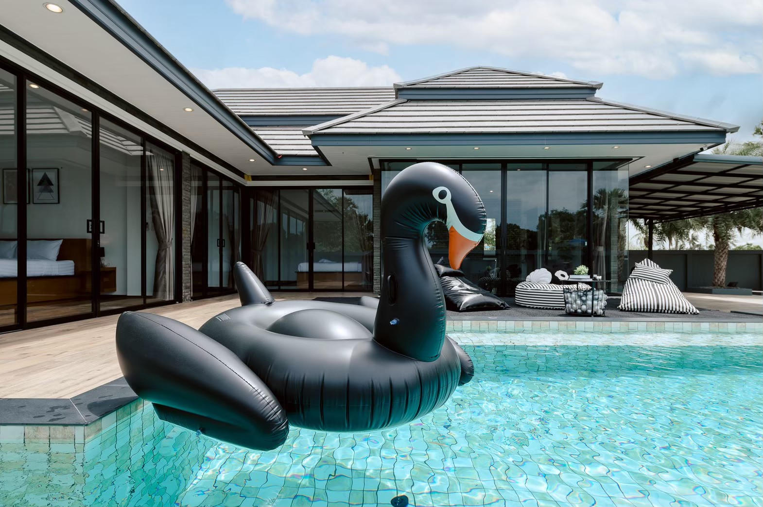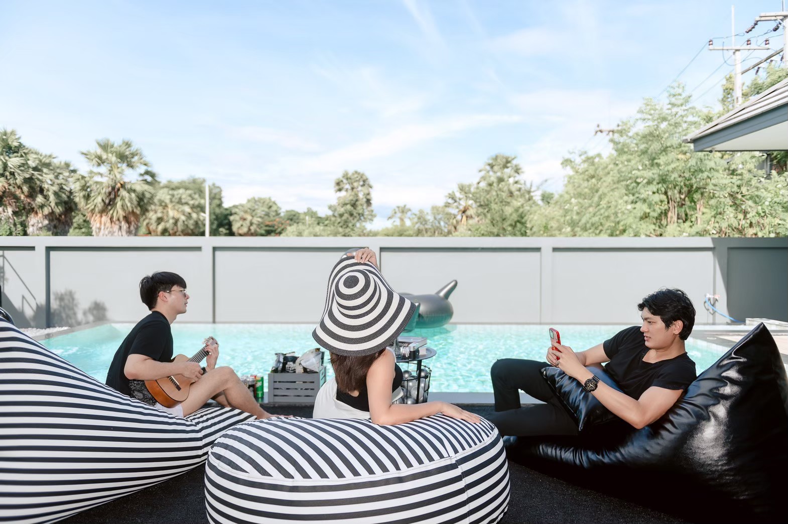 - ห้ามเปิดเครื่องเสียง/ลำโพงนอกบ้านหรือริมสระ