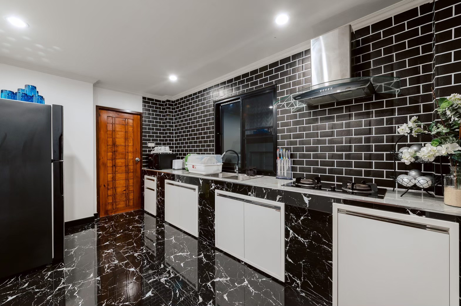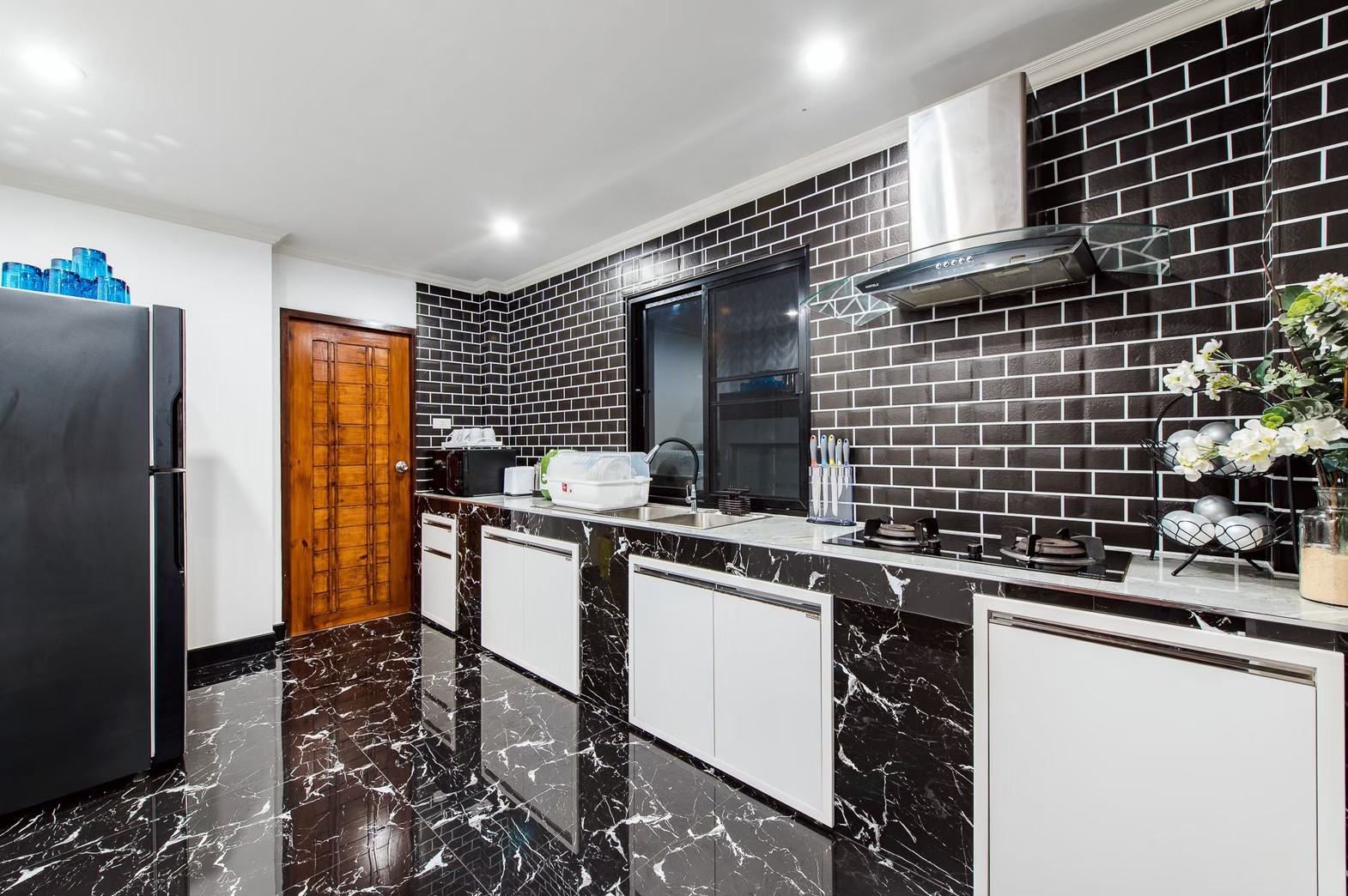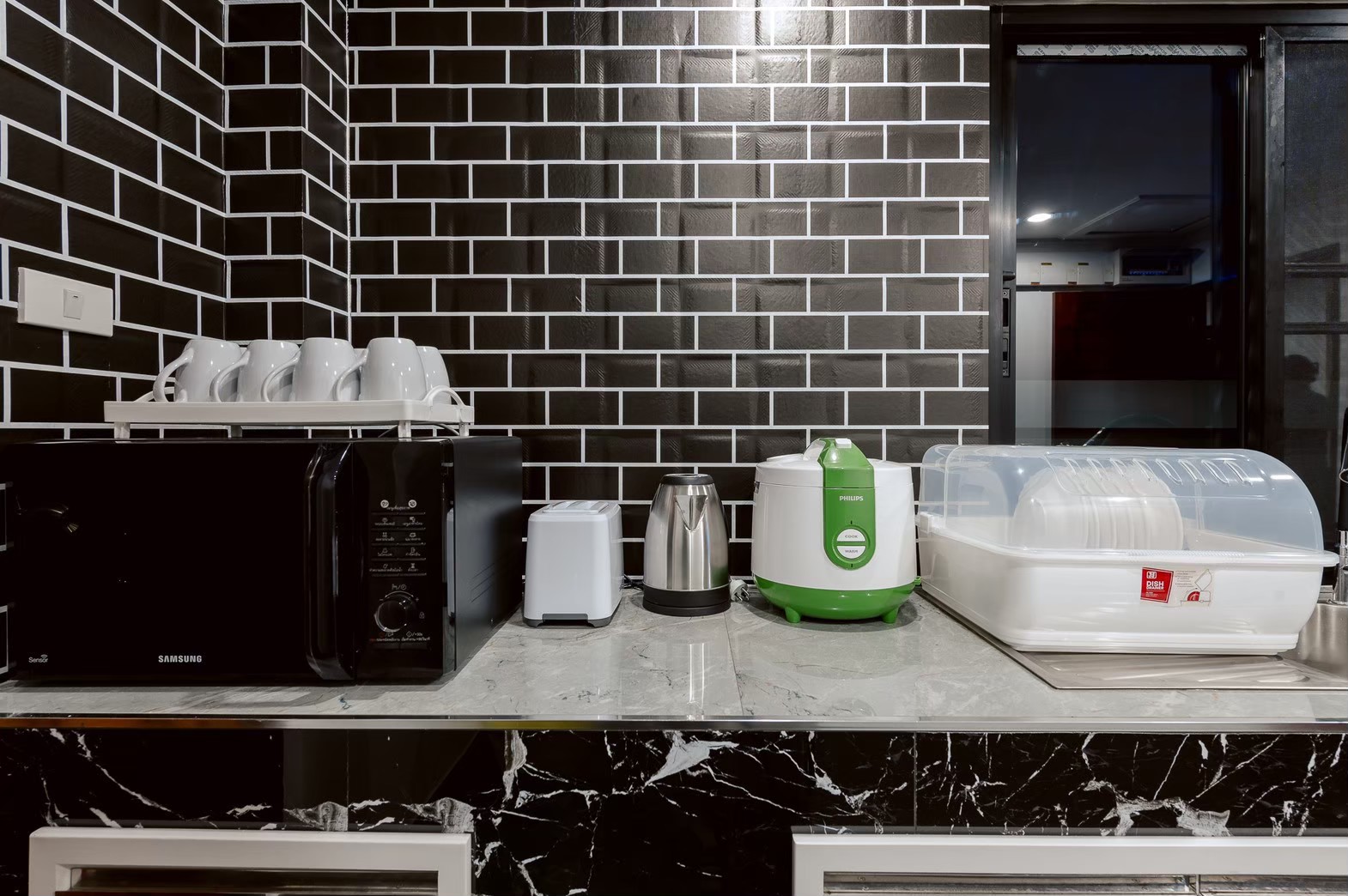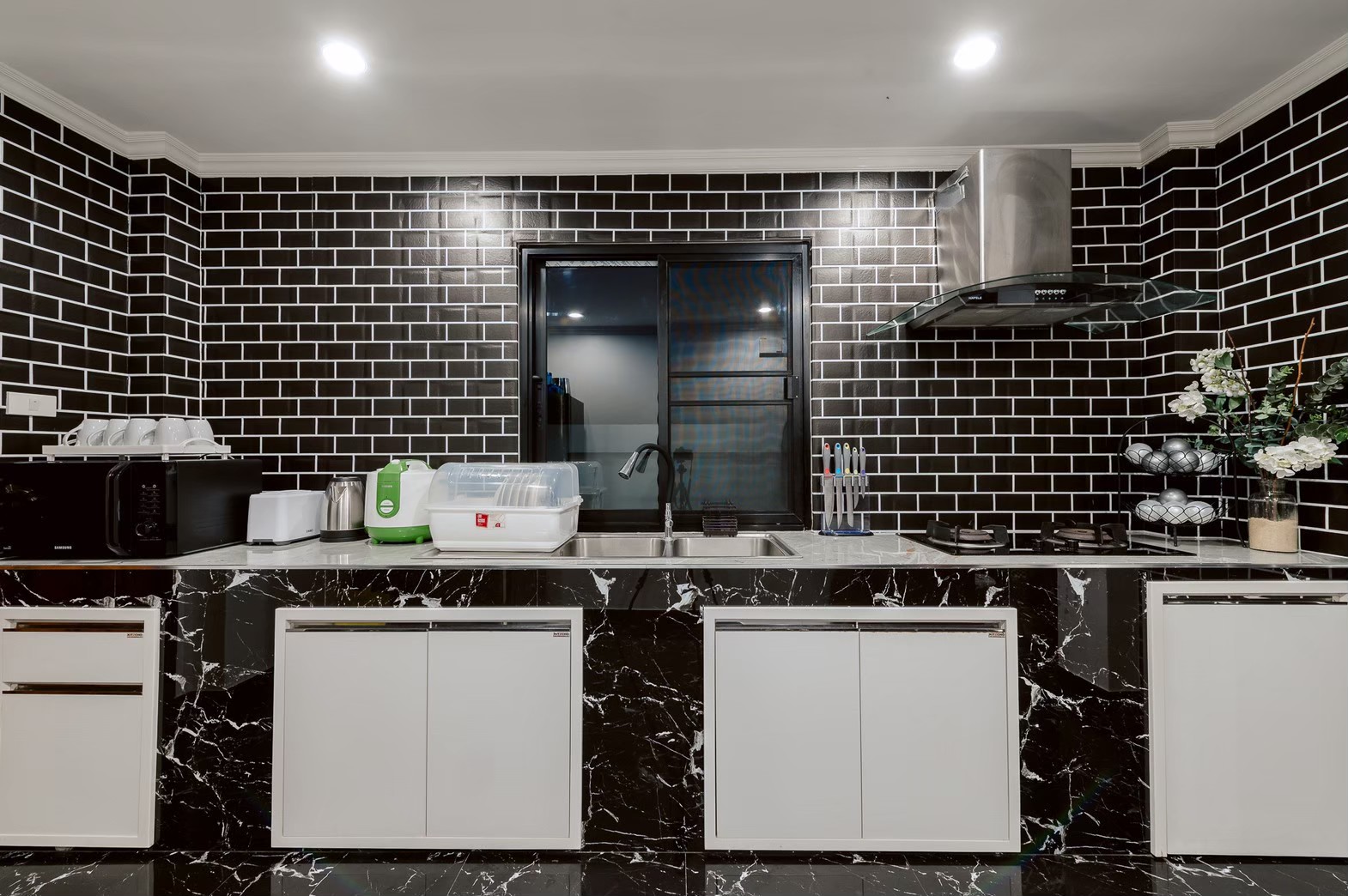 - ครัวพร้อมอุปกรณ์ครบ: เตาแก๊ส กระทะ หม้อ จาน-ชาม ไมโครเวฟ กระติกน้ำร้อน ตู้เย็น ครก-สาก เขียง มีด เครื่องปิ้งขนมปัง
