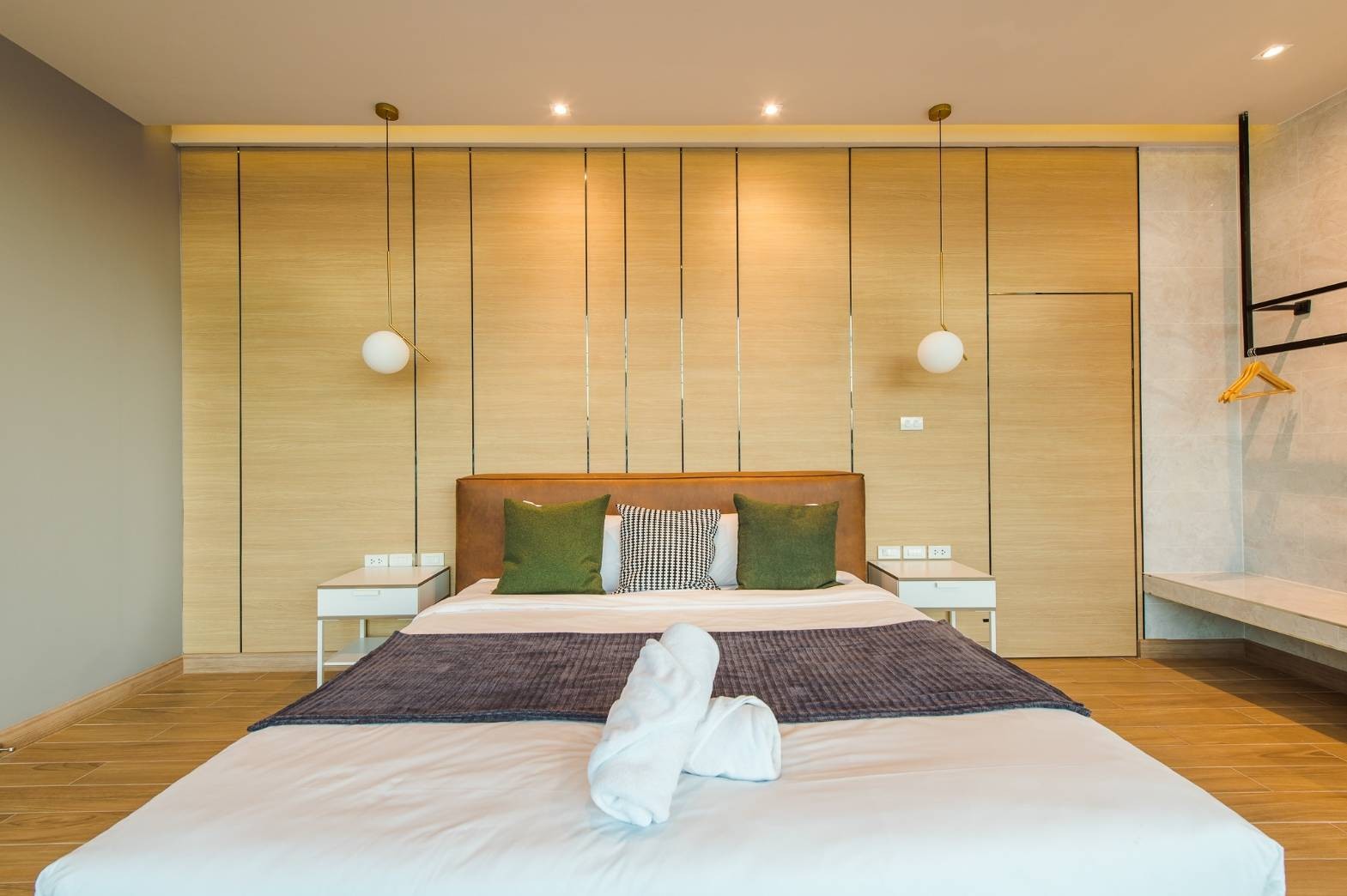 - ห้องนอน 1 : เตียง 6 ฟุต 1 เตียง นอนได้ 2 คน พร้อมห้องน้ำในตัว และวิวสระ