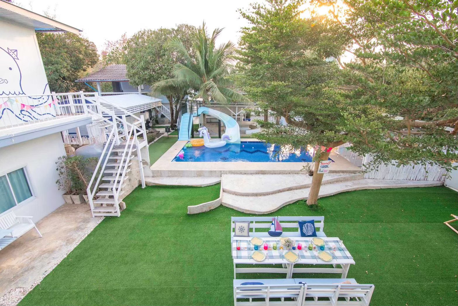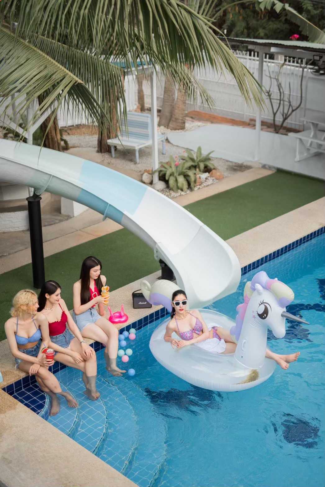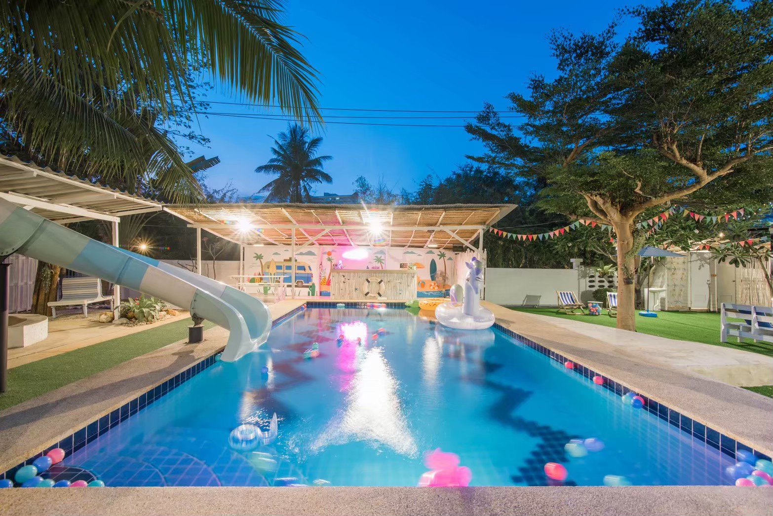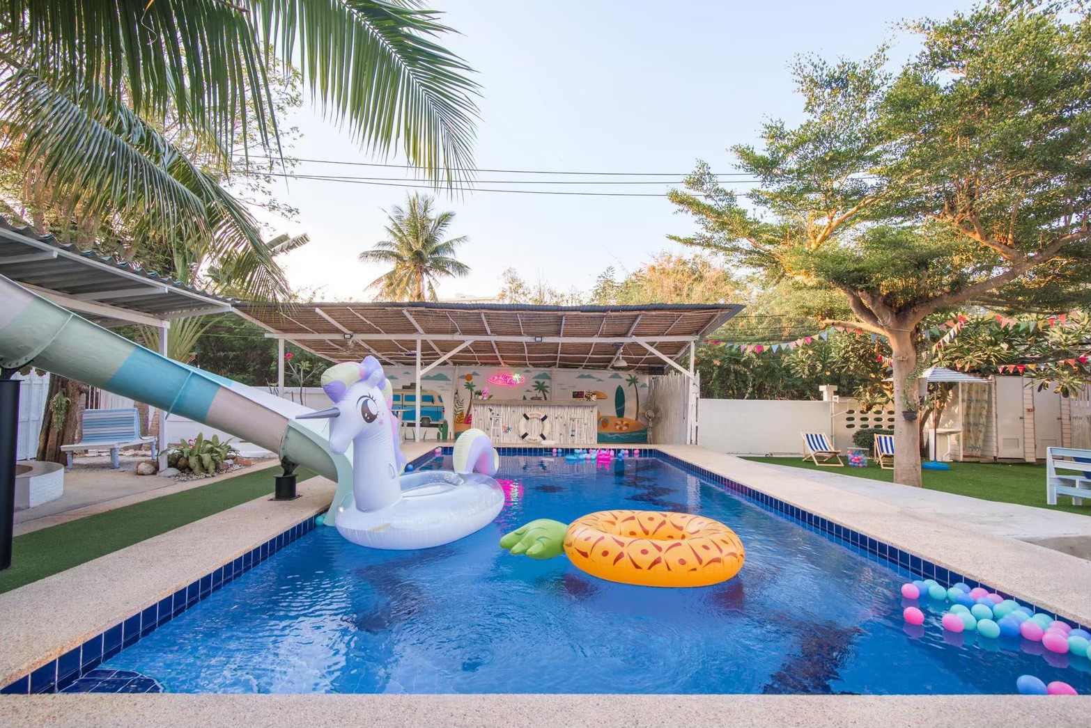 - สระว่ายน้ำระบบคลอรีน พร้อมสไลเดอร์สีขาวฟ้า