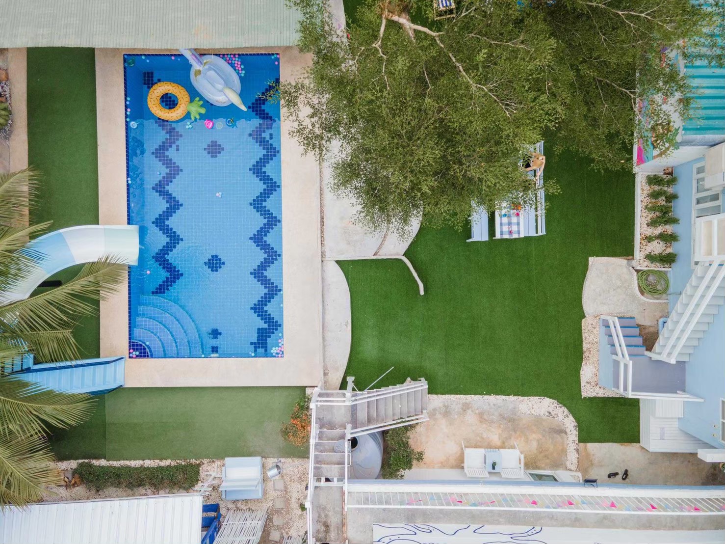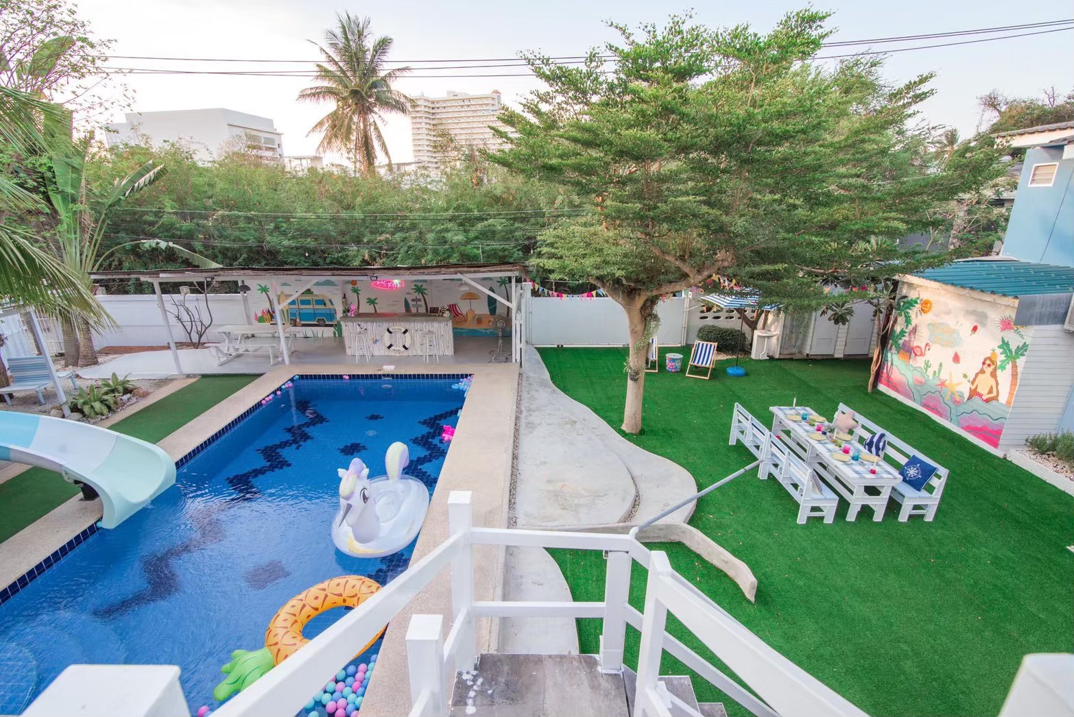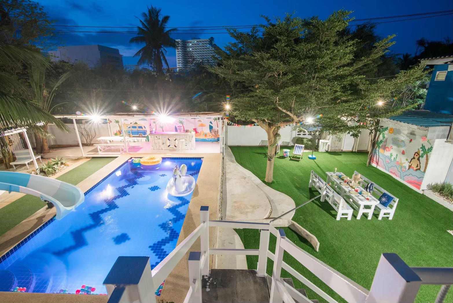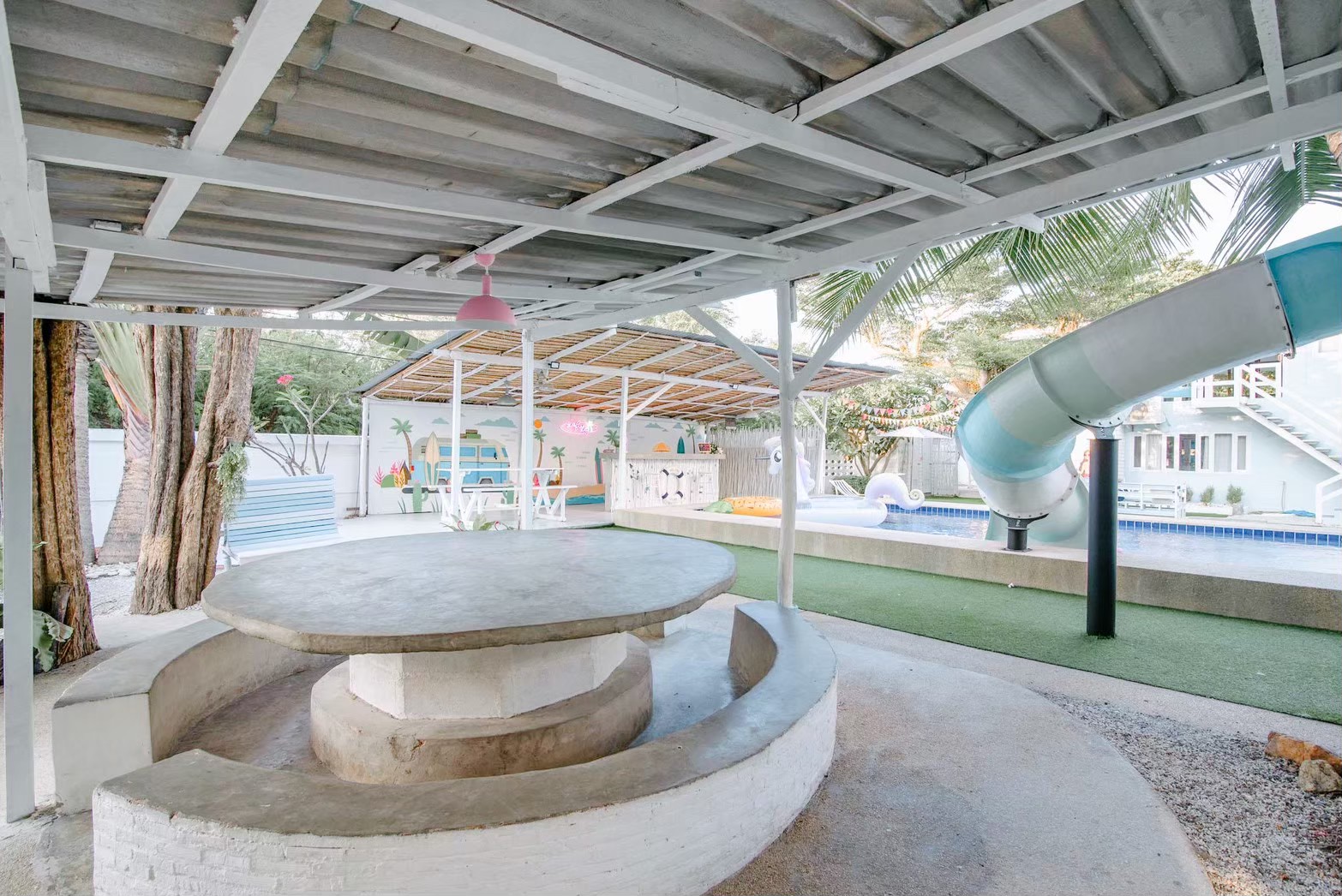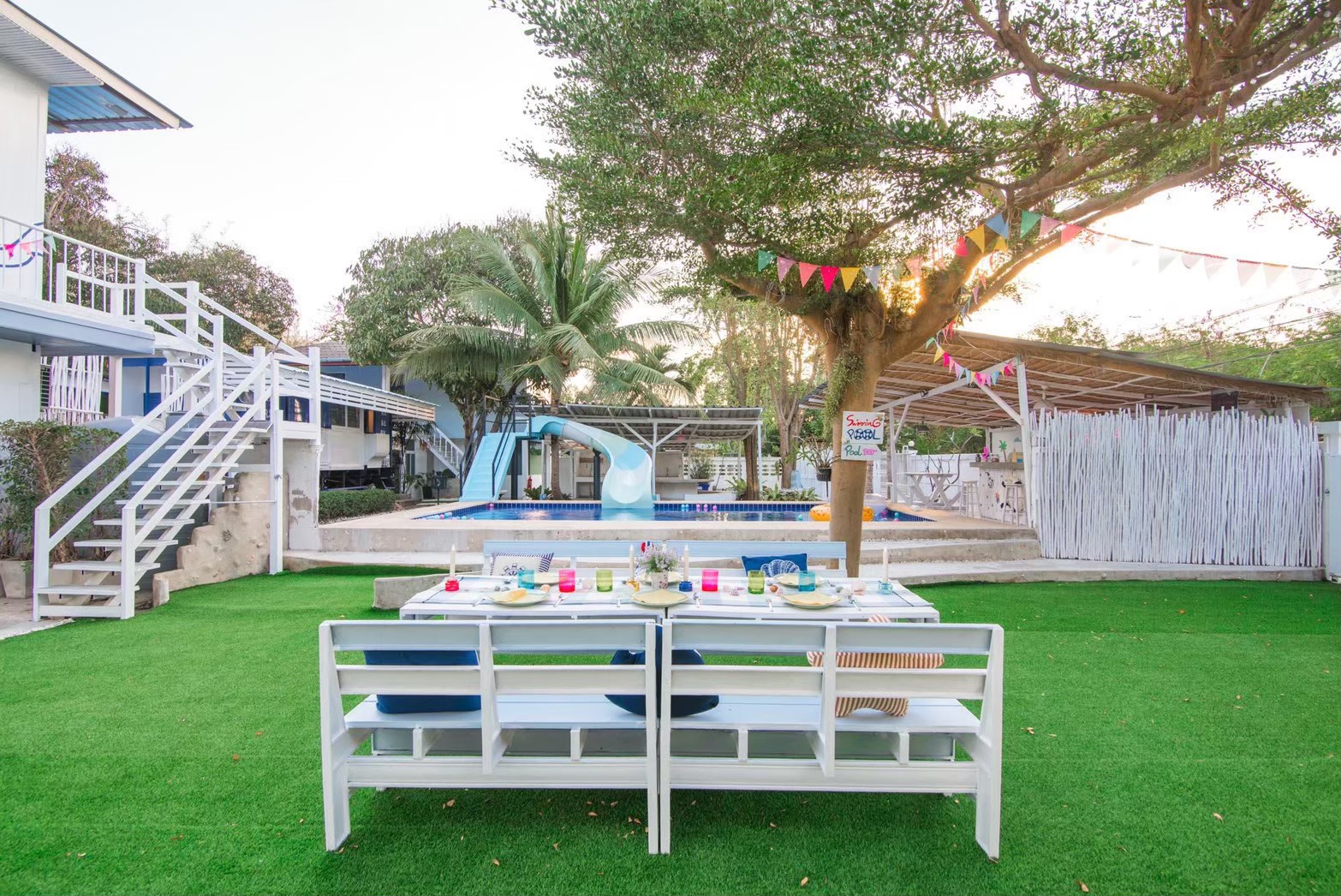 - สระว่ายน้ำระบบคลอรีน พร้อมสไลเดอร์สีขาวฟ้า