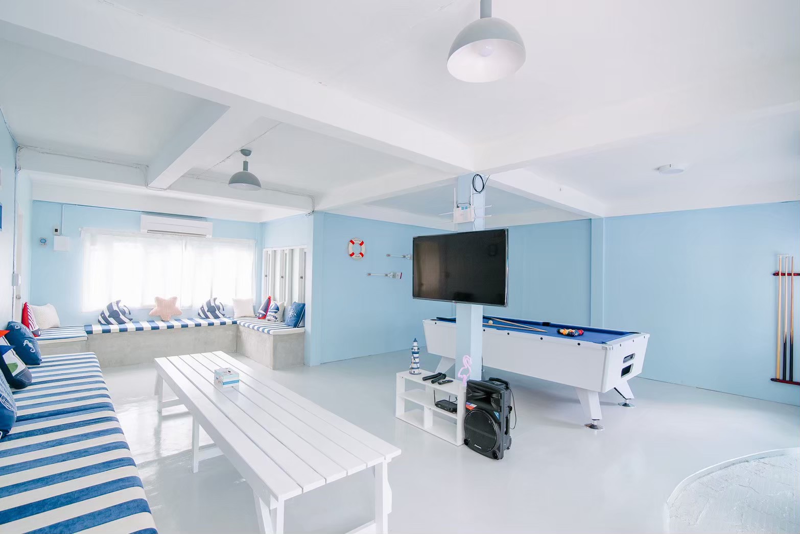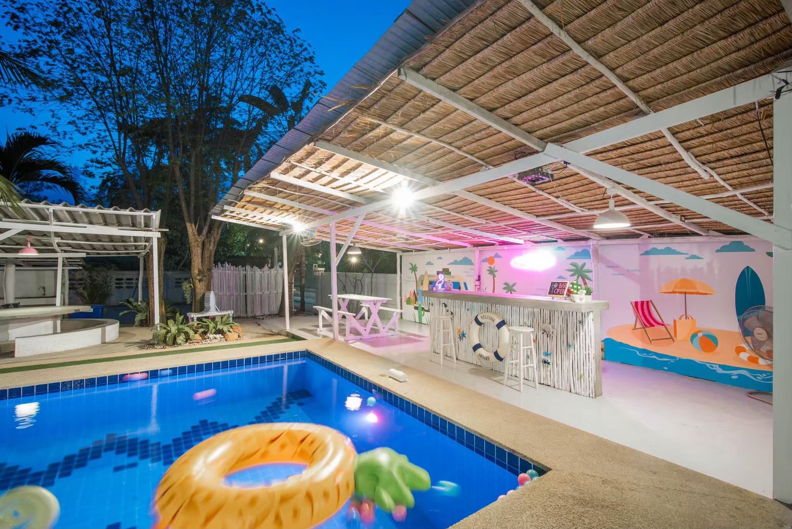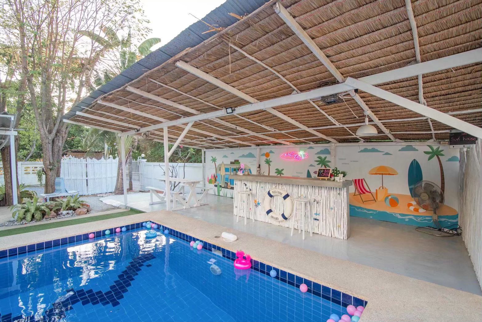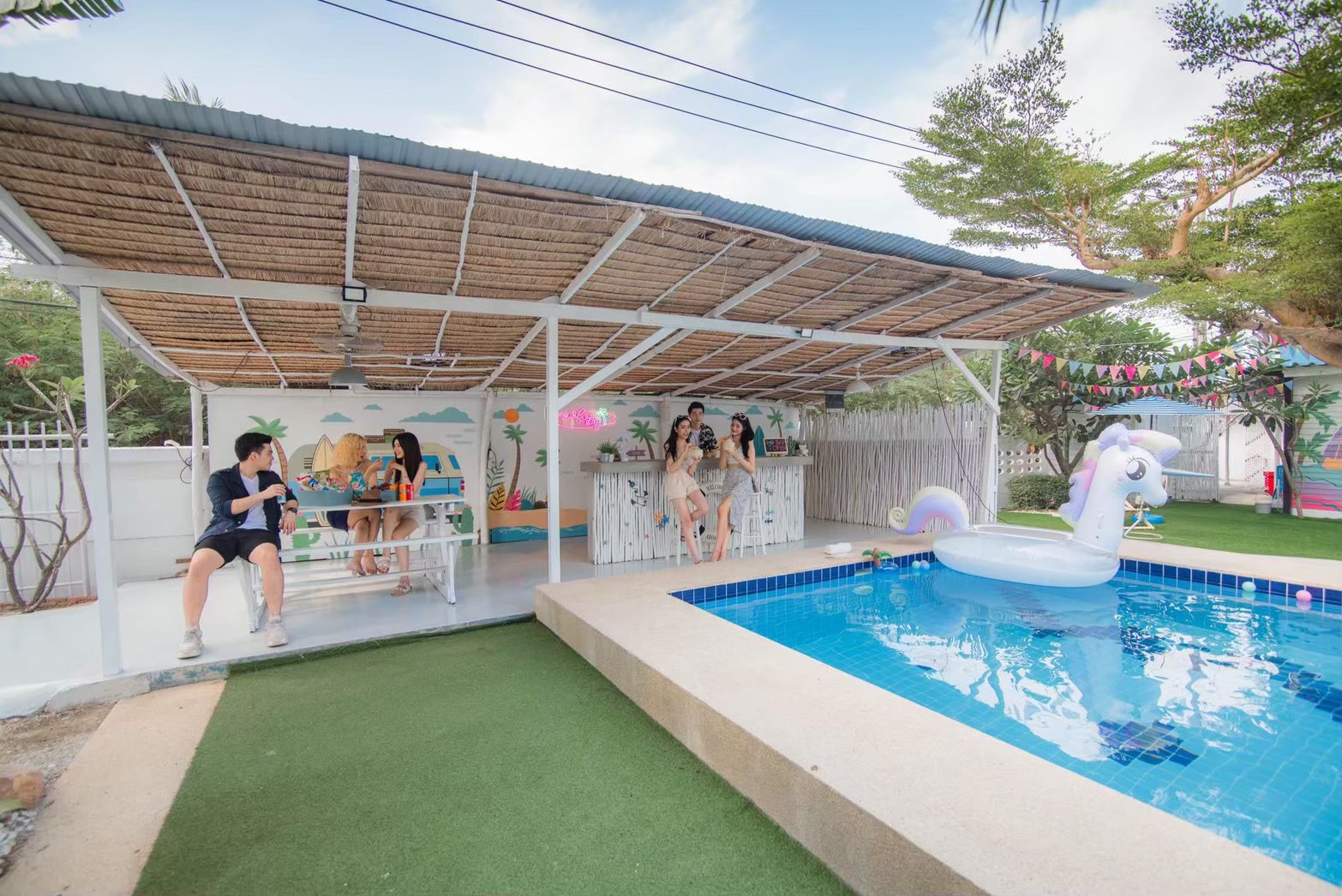 - เคาน์เตอร์บาร์ริมสระ โต๊ะพูล Smart TV + คาราโอเกะ YouTube