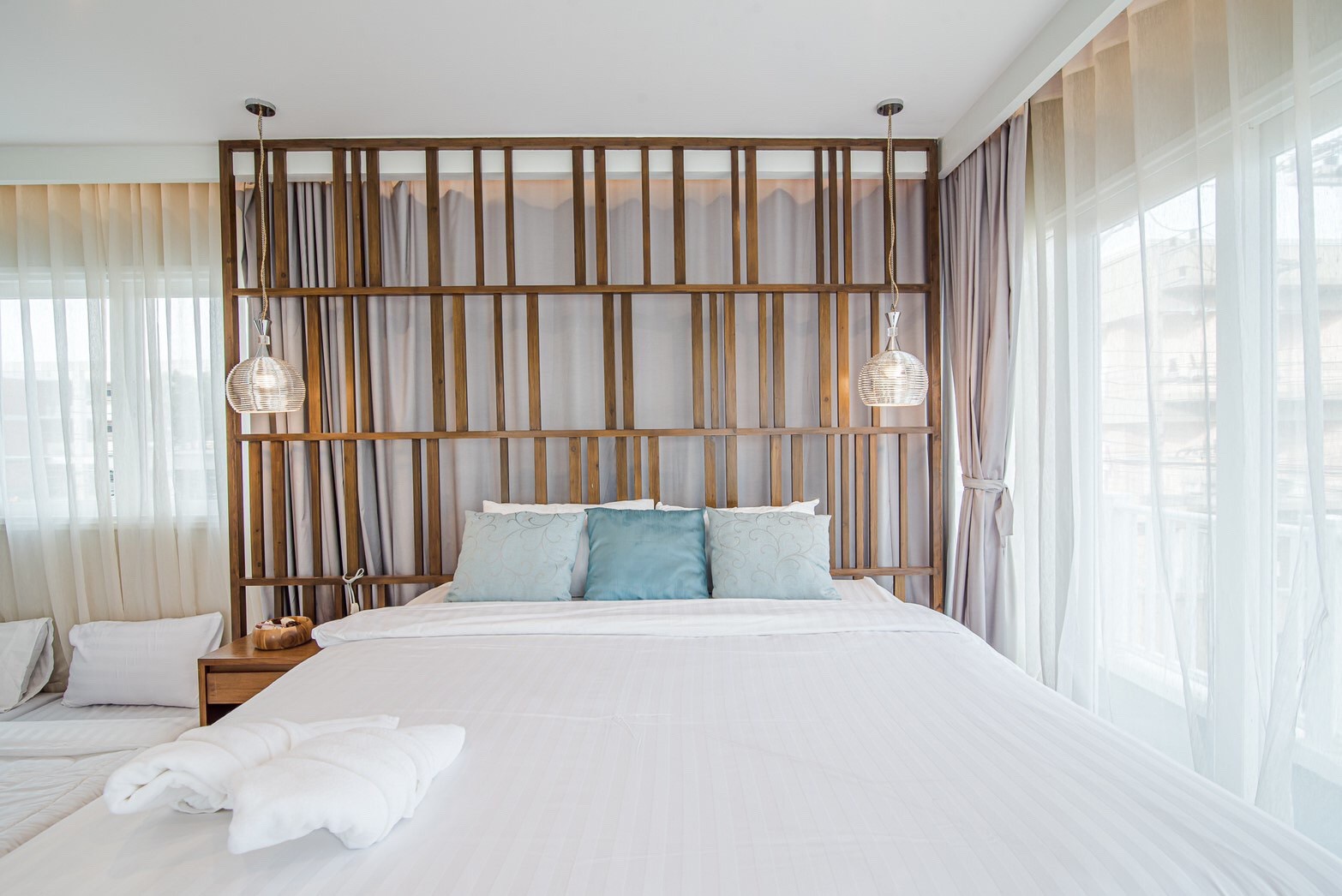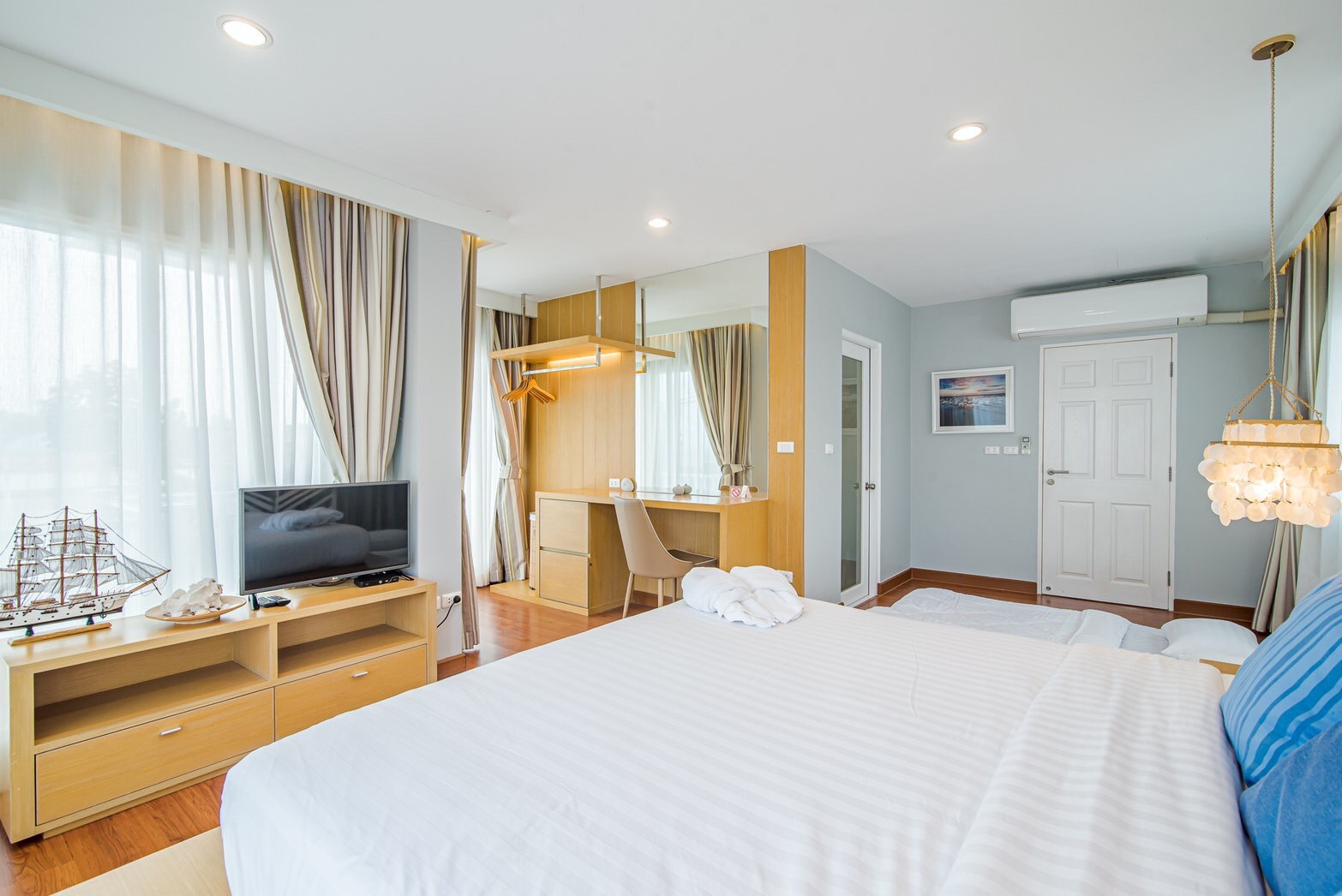 - ห้องที่ 1 : เตียง 6 ฟุต 1 เตียง + ฟูกเสริม 2 เตียง (มีทีวี)