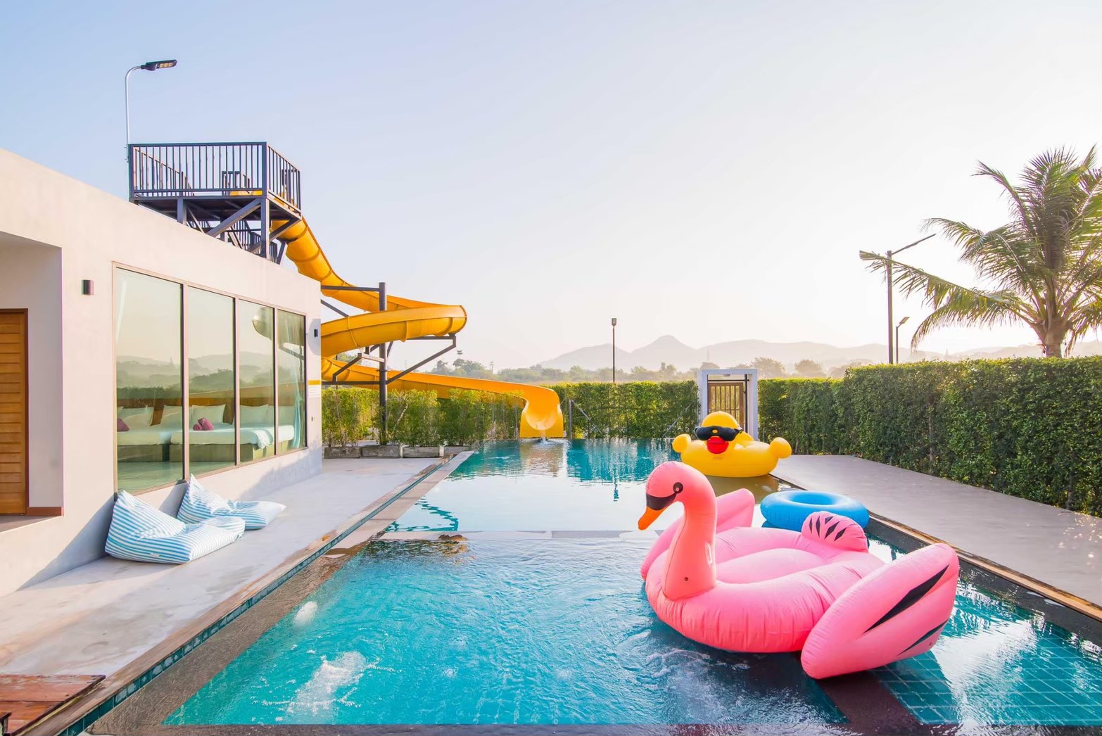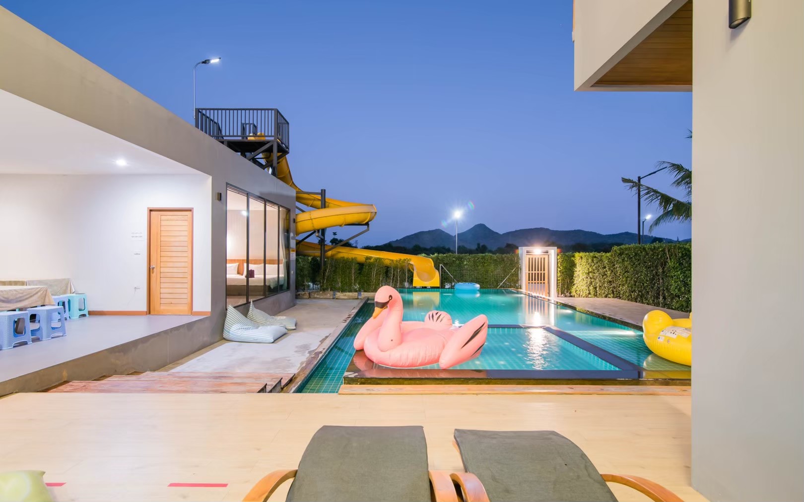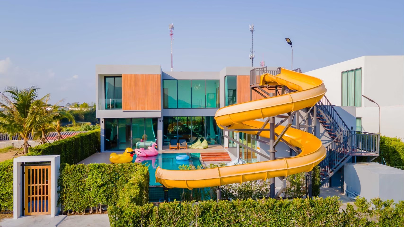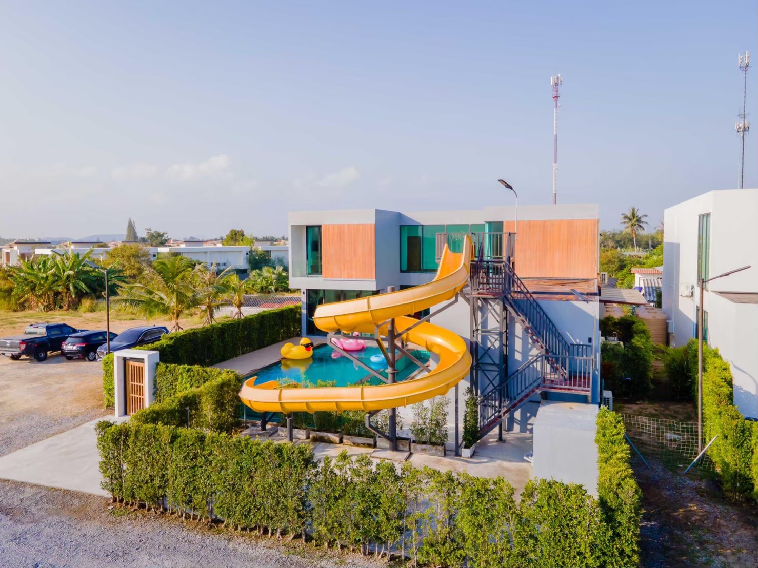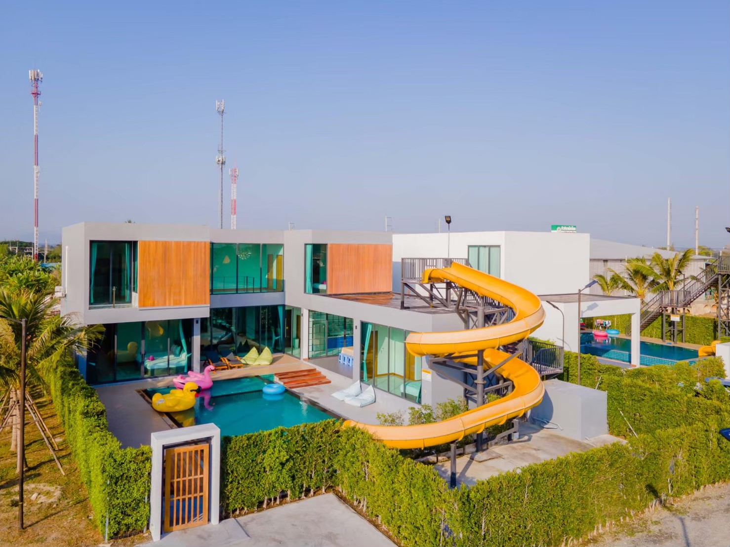 V LEVEL 2 Huahin Pool Villa บ้านพักพูลวิลล่าหัวหินสไตล์โมเดิร์นสีขาวสะอาดตา บนพื้นที่กว่า 150 ตารางวา บรรยากาศร่มรื่น เหมาะสำหรับครอบครัวหรือกลุ่มเพื่อนขนาดใหญ่ จุดเด่นคือสระว่ายน้ำส่วนตัวพร้อมสไลเดอร์ยาวสูงถึง 30 เมตร (ยาวที่สุดในหัวหิน) ภายในตกแต่งหรูหราด้วยหินอ่อน เตียงนอนจำนวนมาก รองรับผู้เข้าพักได้สูงสุดถึง 40 ท่าน