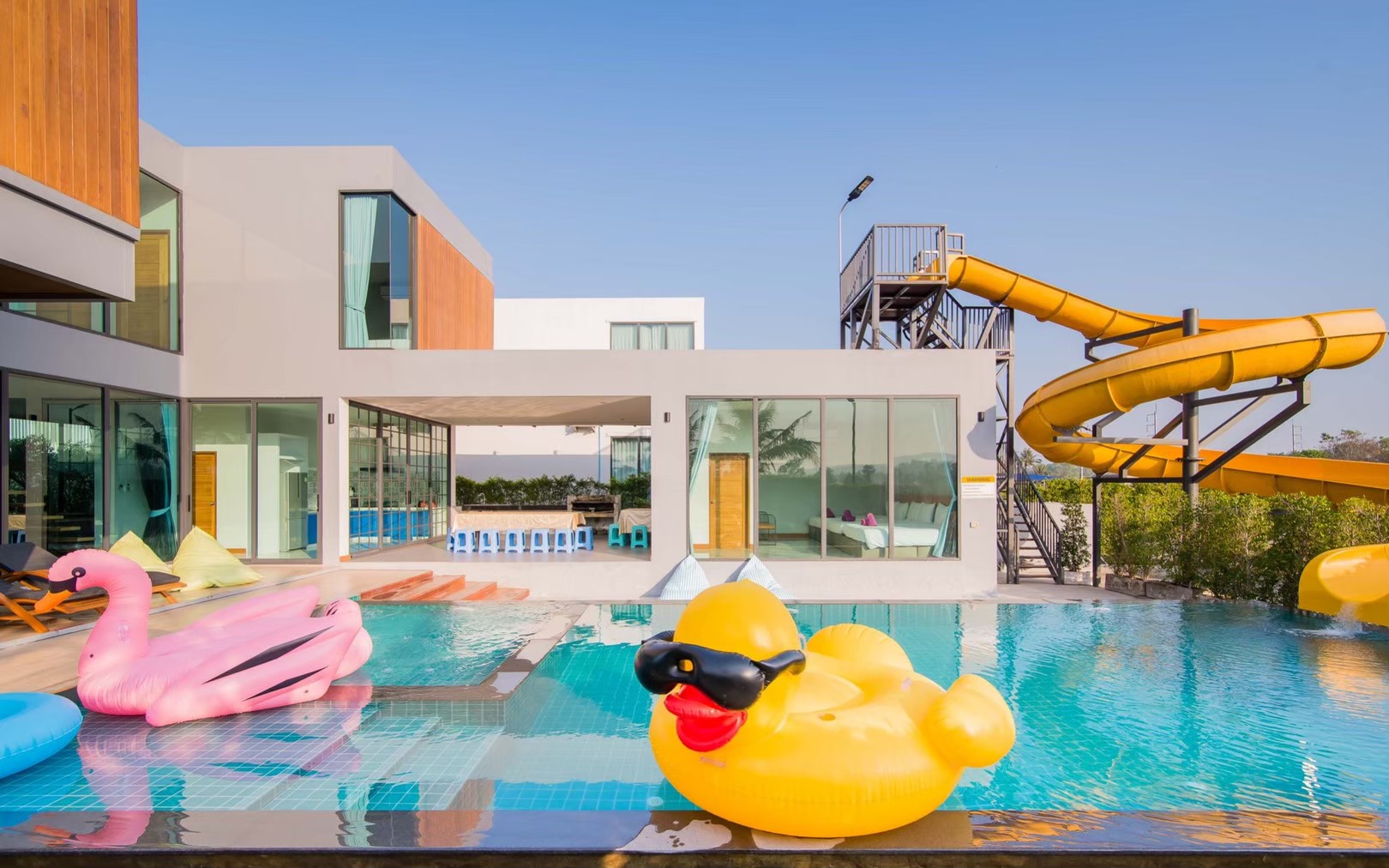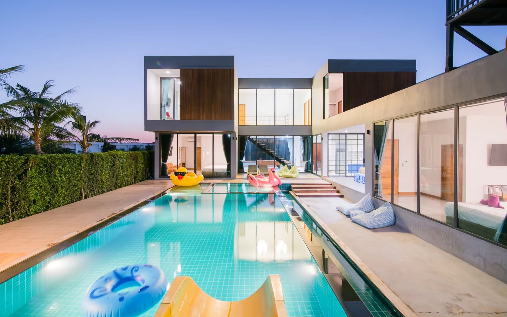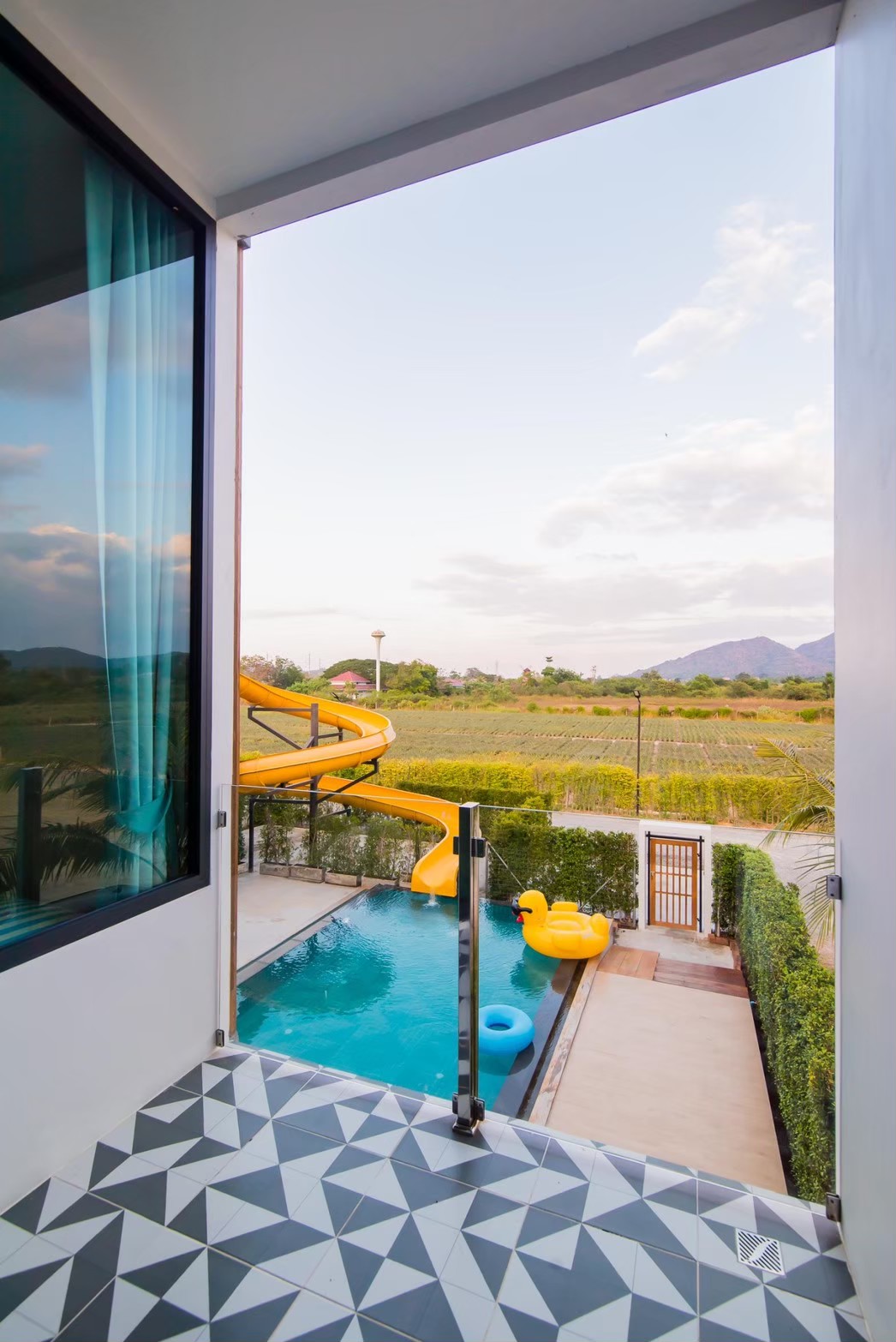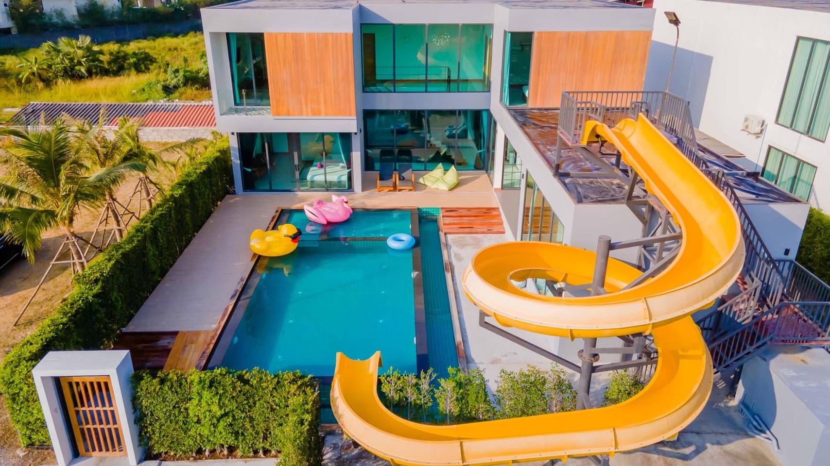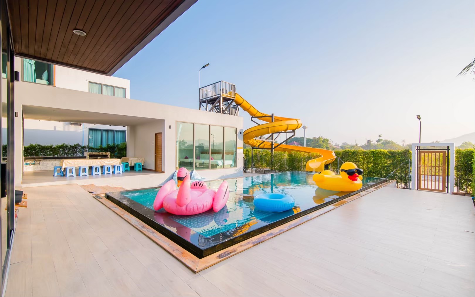 V LEVEL 2 Huahin Pool Villa บ้านพักพูลวิลล่าหัวหินสไตล์โมเดิร์นสีขาวสะอาดตา บนพื้นที่กว่า 150 ตารางวา บรรยากาศร่มรื่น เหมาะสำหรับครอบครัวหรือกลุ่มเพื่อนขนาดใหญ่ จุดเด่นคือสระว่ายน้ำส่วนตัวพร้อมสไลเดอร์ยาวสูงถึง 30 เมตร (ยาวที่สุดในหัวหิน) ภายในตกแต่งหรูหราด้วยหินอ่อน เตียงนอนจำนวนมาก รองรับผู้เข้าพักได้สูงสุดถึง 40 ท่าน