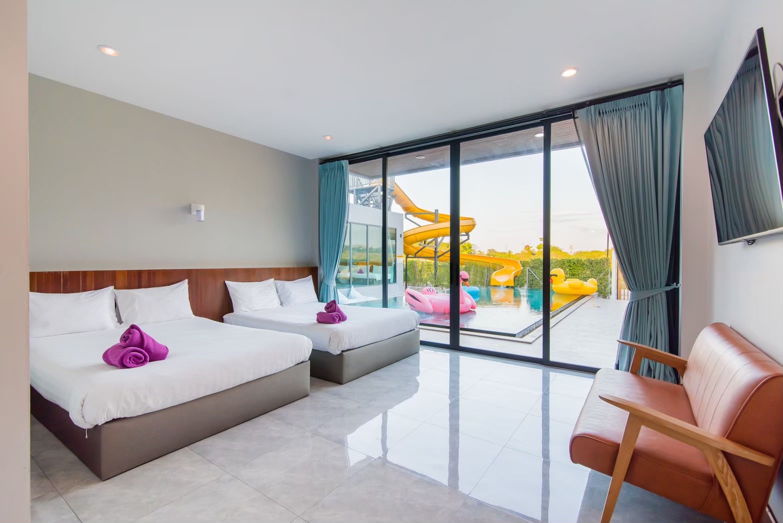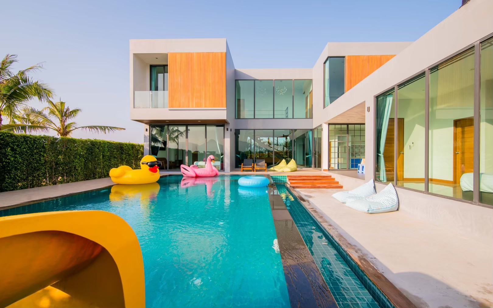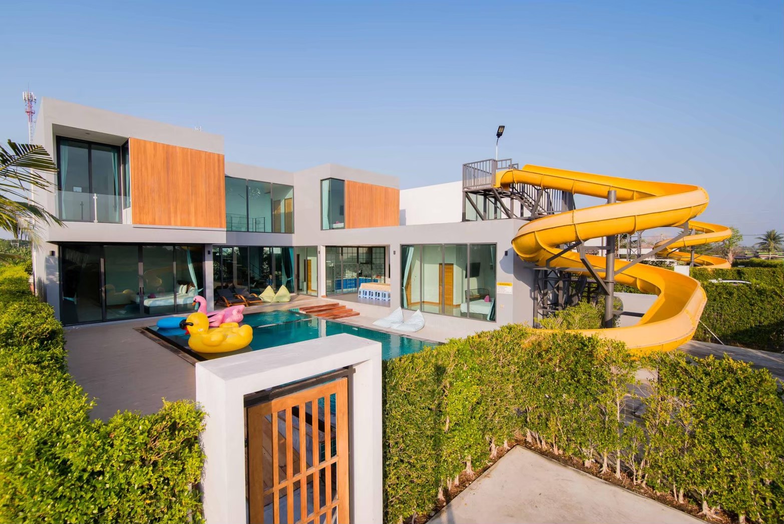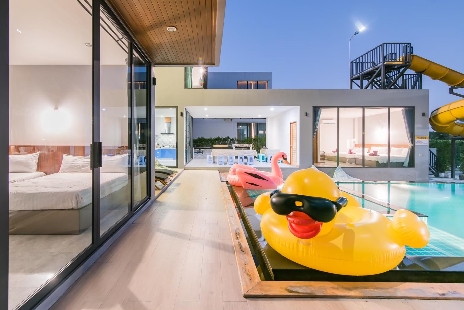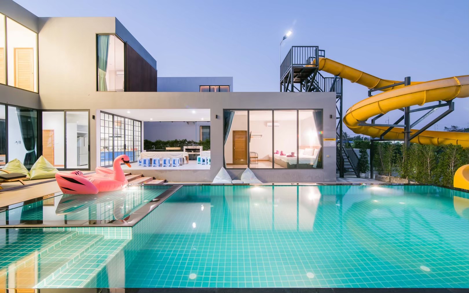 V LEVEL 2 Huahin Pool Villa บ้านพักพูลวิลล่าหัวหินสไตล์โมเดิร์นสีขาวสะอาดตา บนพื้นที่กว่า 150 ตารางวา บรรยากาศร่มรื่น เหมาะสำหรับครอบครัวหรือกลุ่มเพื่อนขนาดใหญ่ จุดเด่นคือสระว่ายน้ำส่วนตัวพร้อมสไลเดอร์ยาวสูงถึง 30 เมตร (ยาวที่สุดในหัวหิน) ภายในตกแต่งหรูหราด้วยหินอ่อน เตียงนอนจำนวนมาก รองรับผู้เข้าพักได้สูงสุดถึง 40 ท่าน