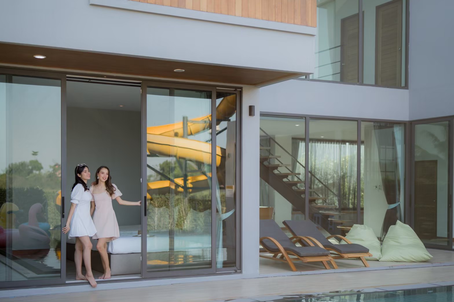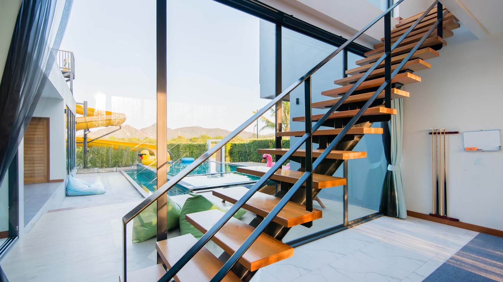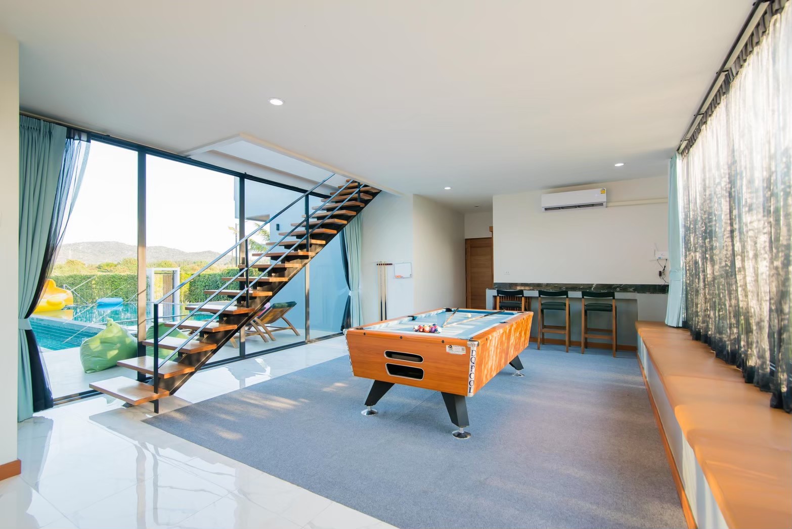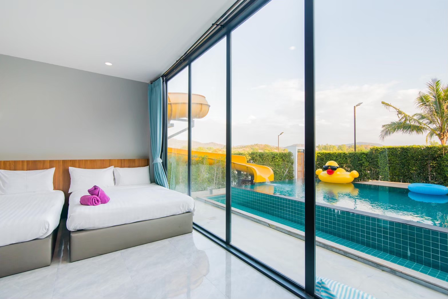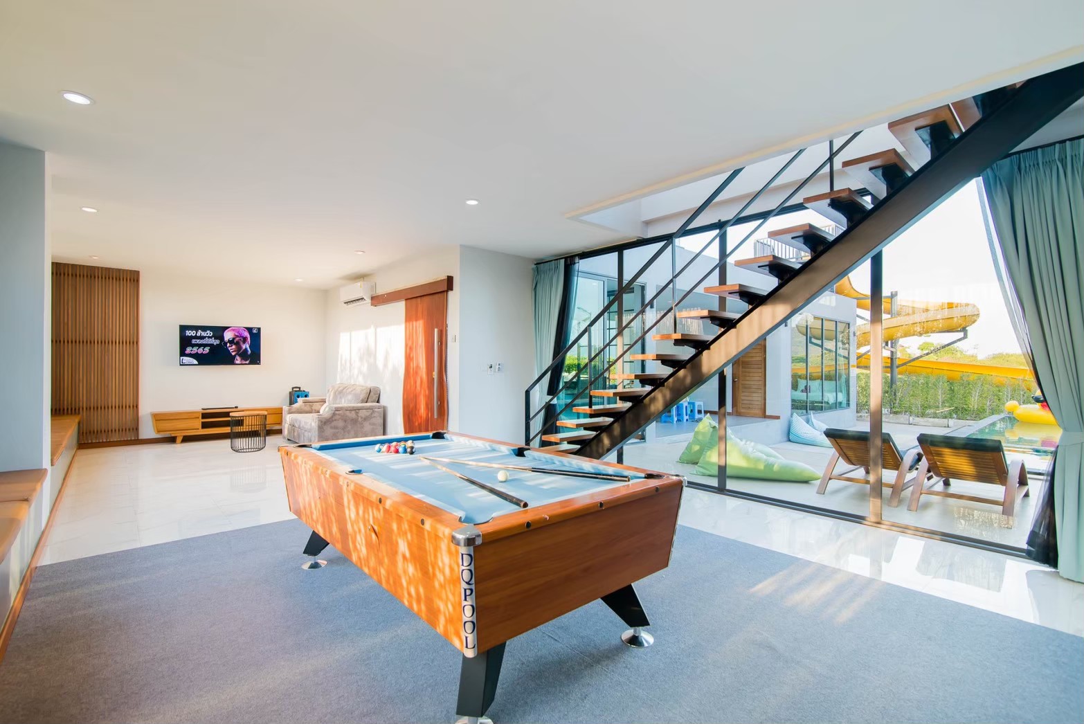 V LEVEL 2 Huahin Pool Villa บ้านพักพูลวิลล่าหัวหินสไตล์โมเดิร์นสีขาวสะอาดตา บนพื้นที่กว่า 150 ตารางวา บรรยากาศร่มรื่น เหมาะสำหรับครอบครัวหรือกลุ่มเพื่อนขนาดใหญ่ จุดเด่นคือสระว่ายน้ำส่วนตัวพร้อมสไลเดอร์ยาวสูงถึง 30 เมตร (ยาวที่สุดในหัวหิน) ภายในตกแต่งหรูหราด้วยหินอ่อน เตียงนอนจำนวนมาก รองรับผู้เข้าพักได้สูงสุดถึง 40 ท่าน